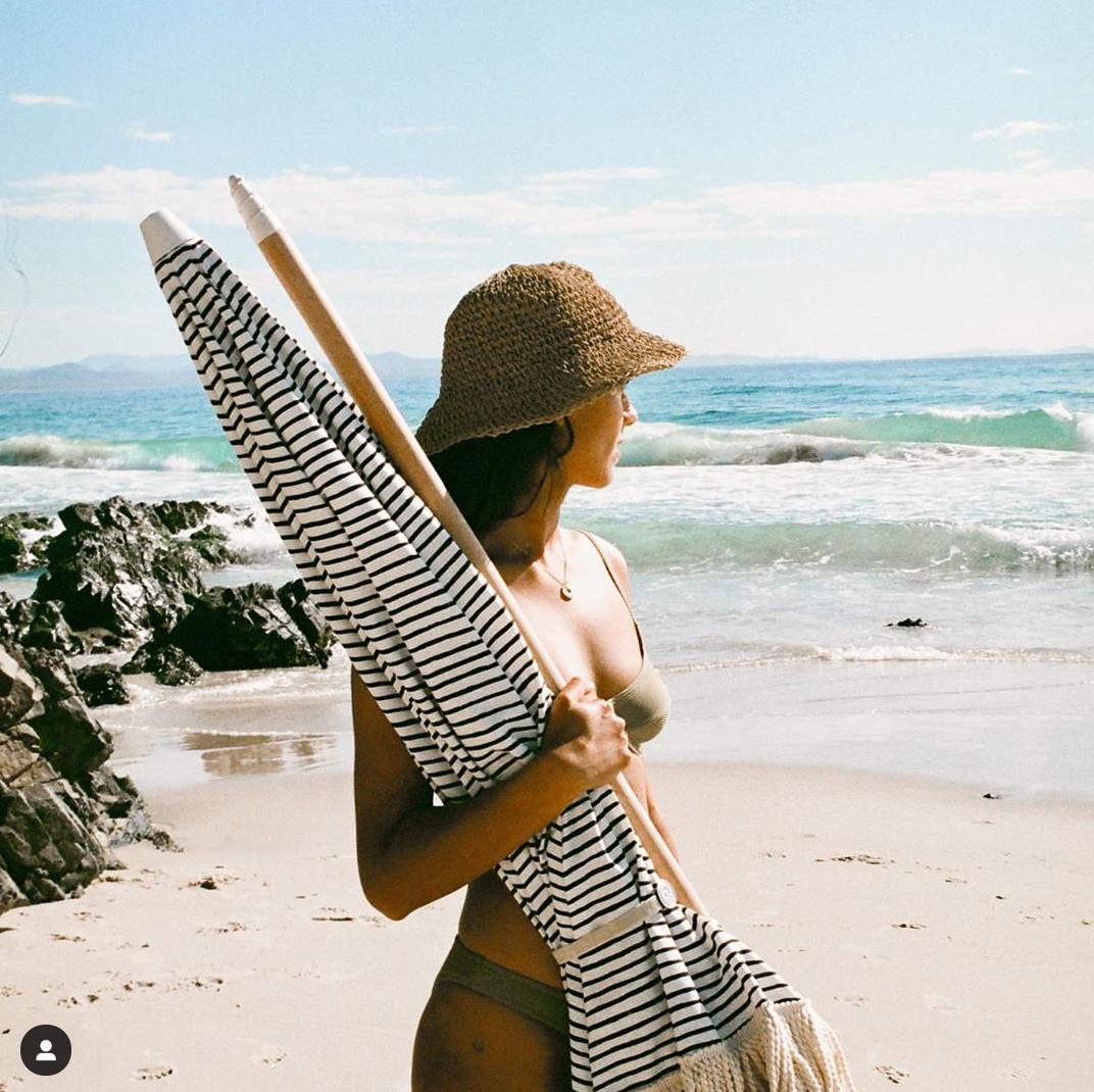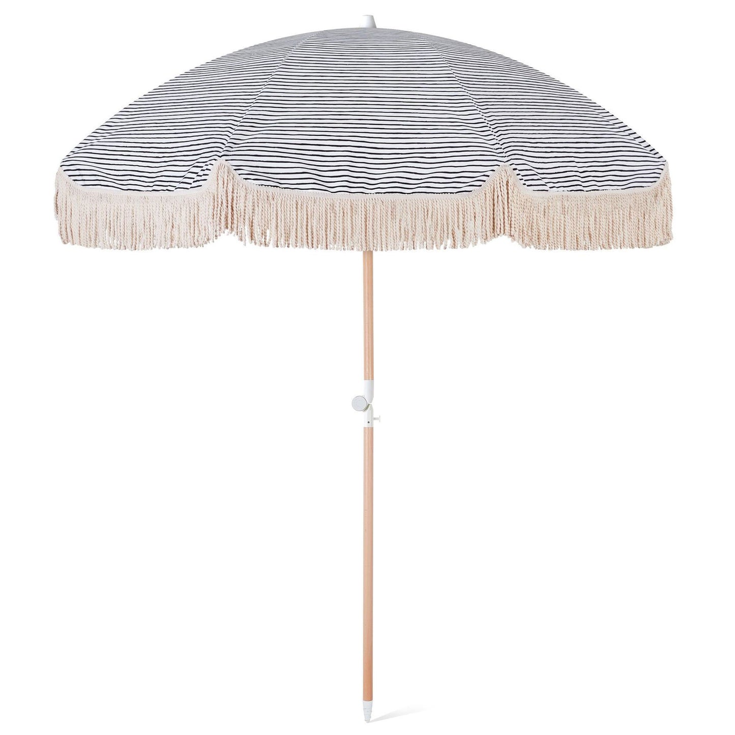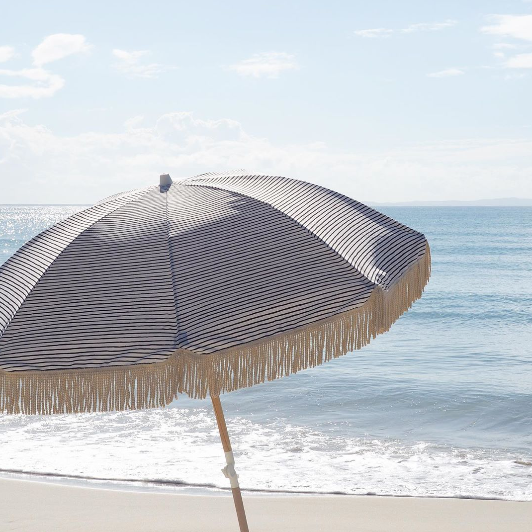 The Natural Instinct beach umbrella is designed by Byron Bay-based, Sunday Supply Co. The umbrella features a simple, unique take on the classic stripe, tailored for the modern beach goer. A classy, thin, black/charcoal hand-drawn line makes for a subtle texture up close.