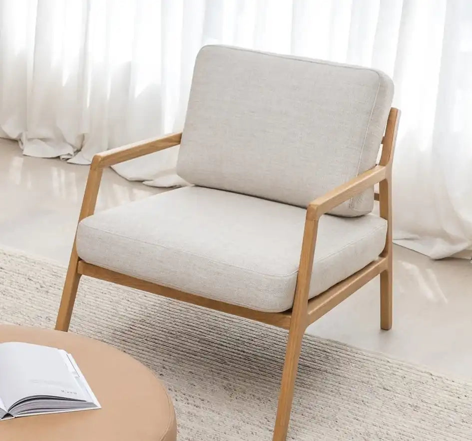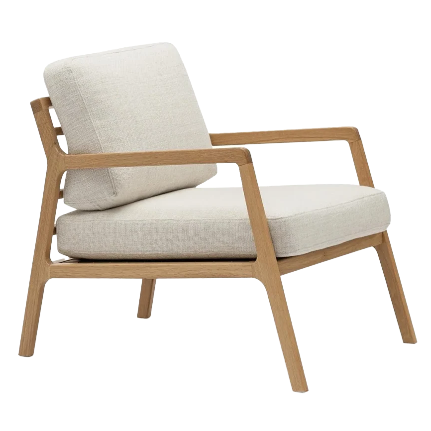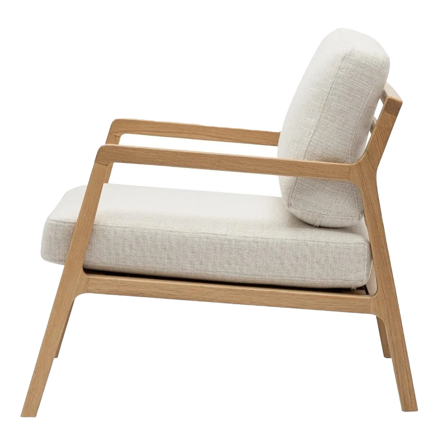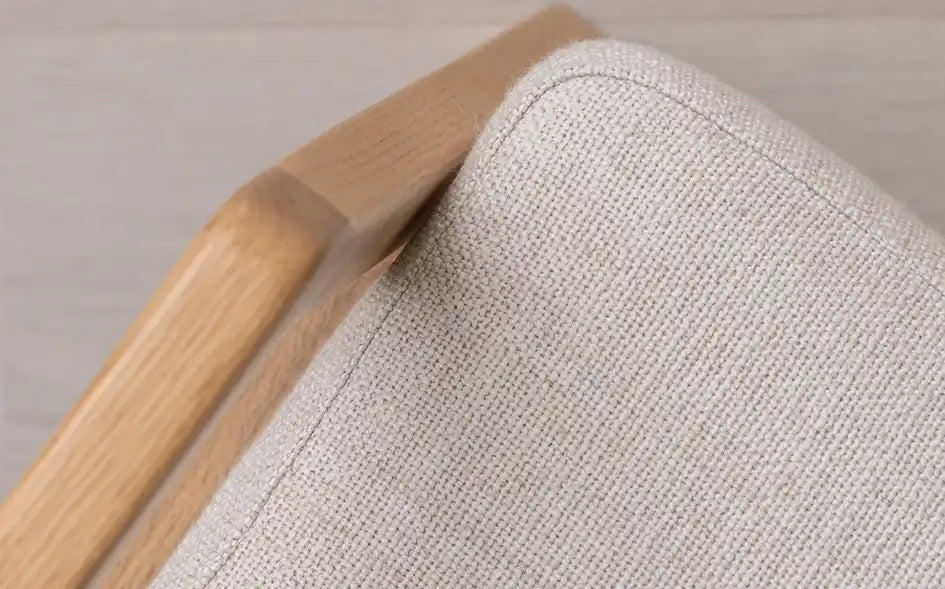 Featuring a solid oak frame, that is sanded and polished countless times to get the maximum expression from the high-quality timber, and paired beautifully with upholstered cushions in a soft Belgian fabric, Westlake oatmeal.