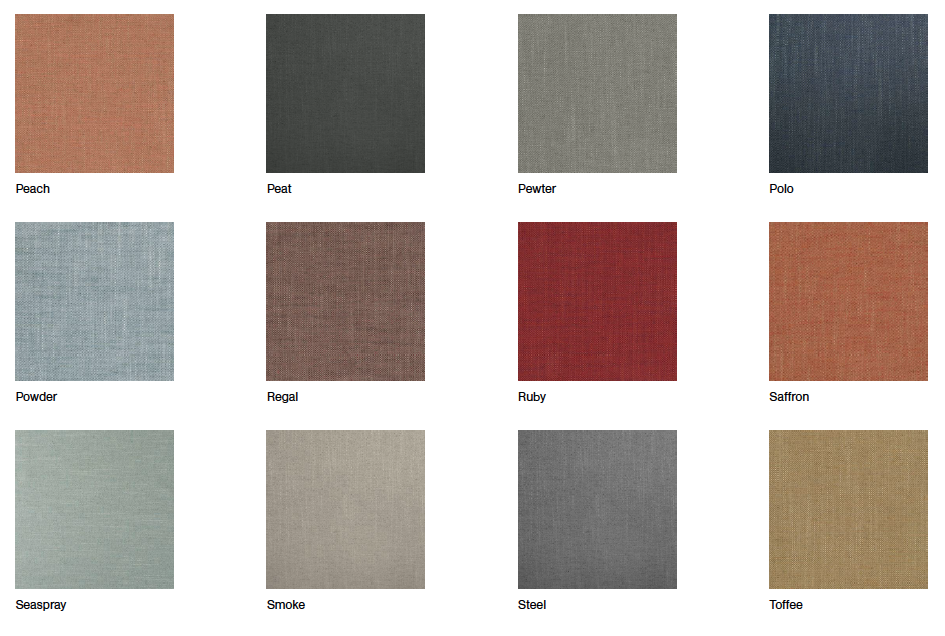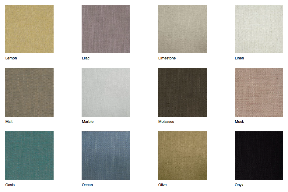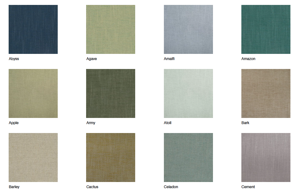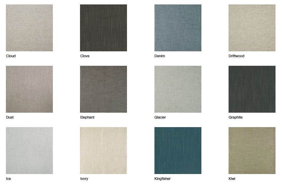 Colours: army green, barley, celadon, cloud, clove, driftwood, dusk, graphite, limestone, linen, malt, marble, molasses, musk, ocean, olive, onyx, peat, pewter, polo, powder, toffee, steel, smoke & more..