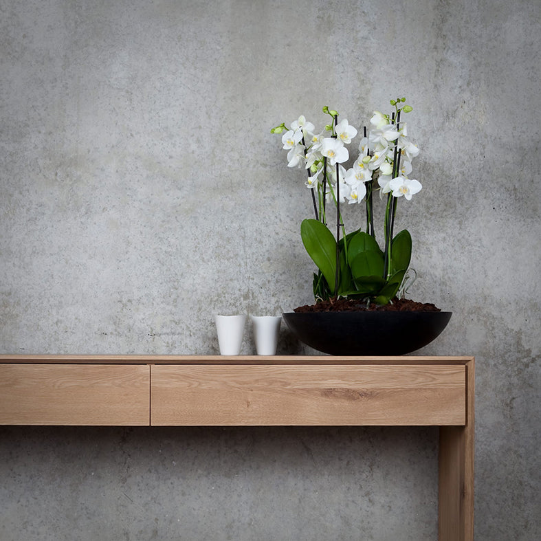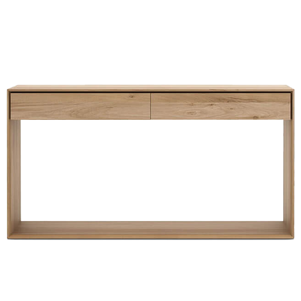 This striking two drawer oak console is characterised by clean lines and contemporary aesthetics, and will complement any living area.