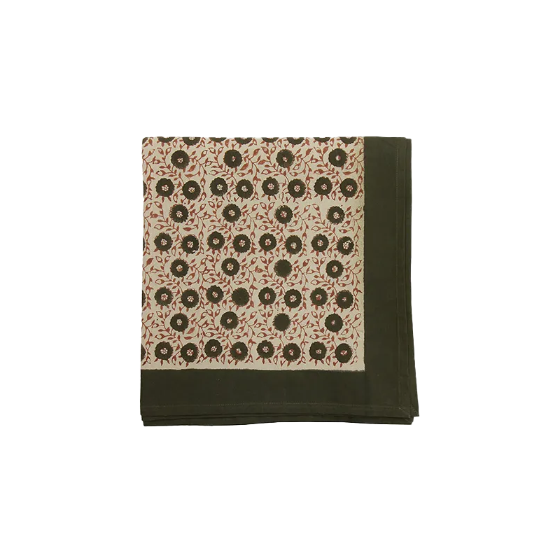 Made of 100% cotton and featuring a charming floral motif in earthy green and rust tones, bordered by a solid green edge. Crafted using traditional hand block printing techniques.