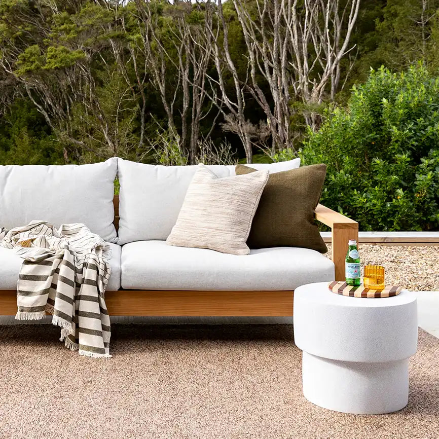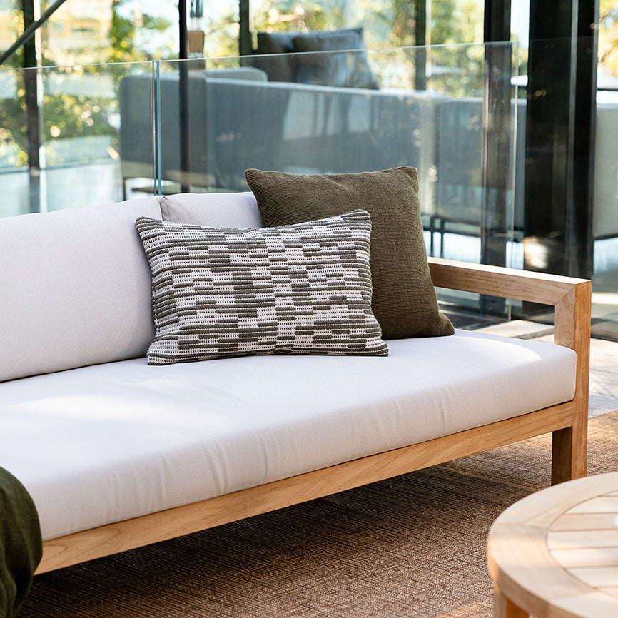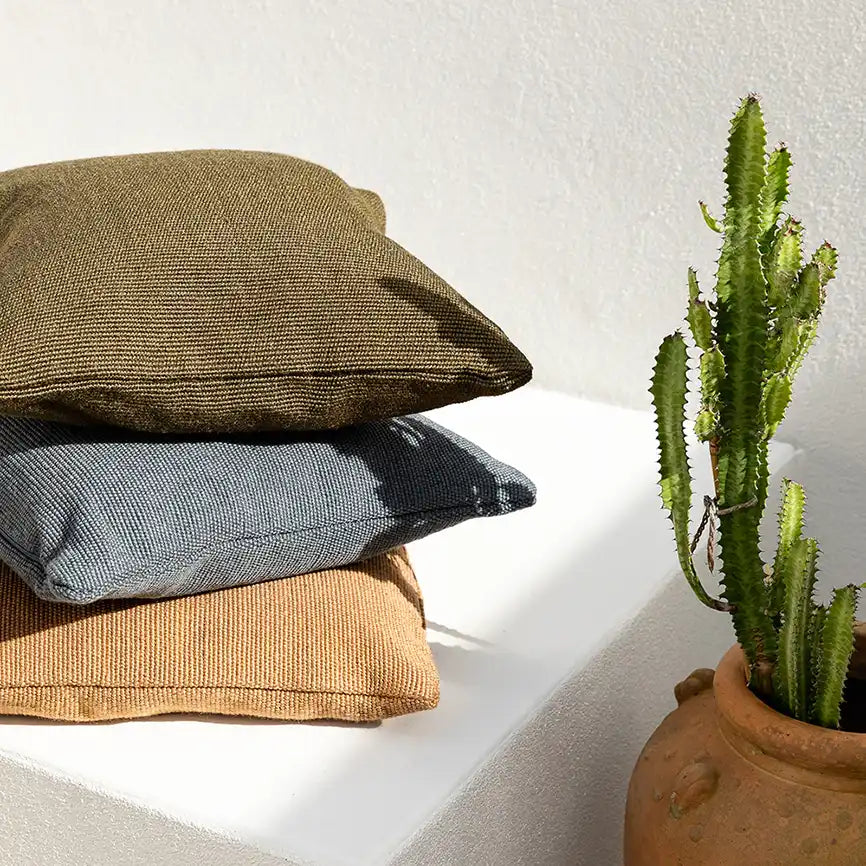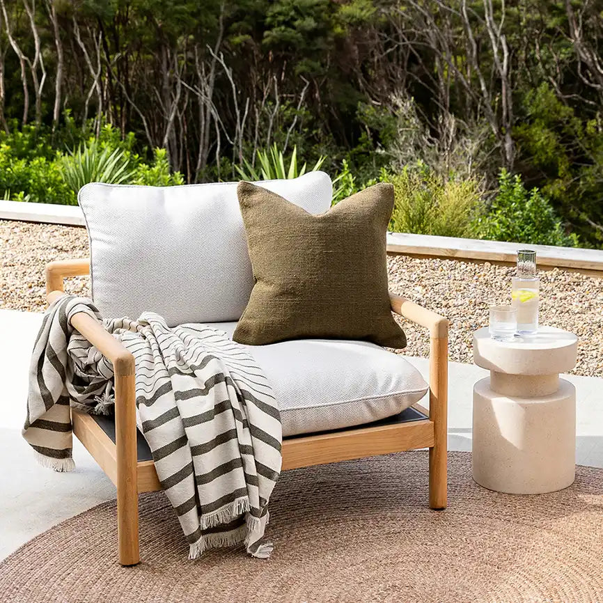 The rich textural weave and warm olive tone of the clipper cushion will elevate your outdoor space.
