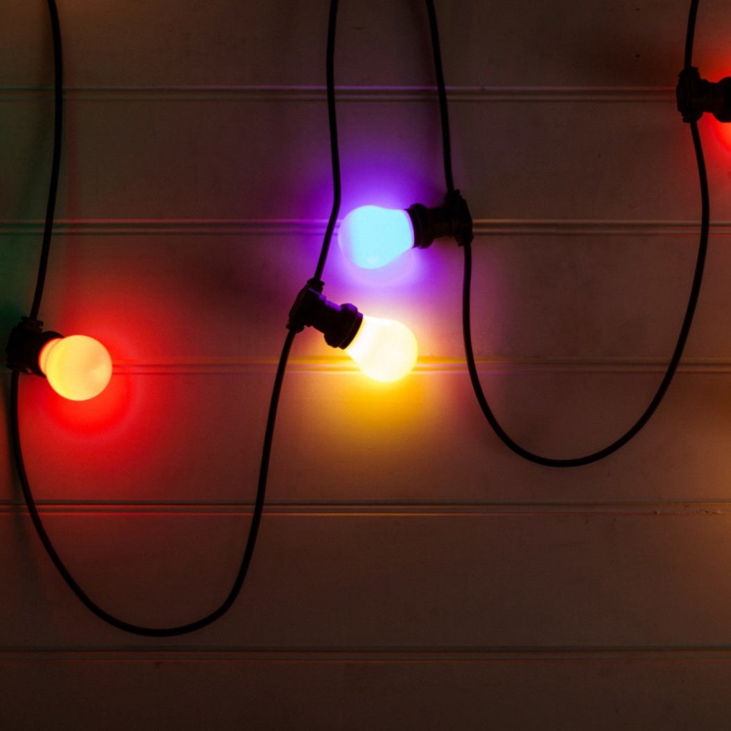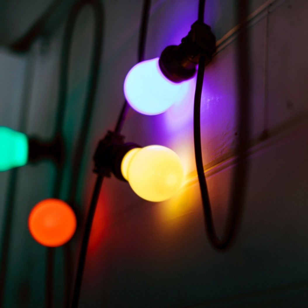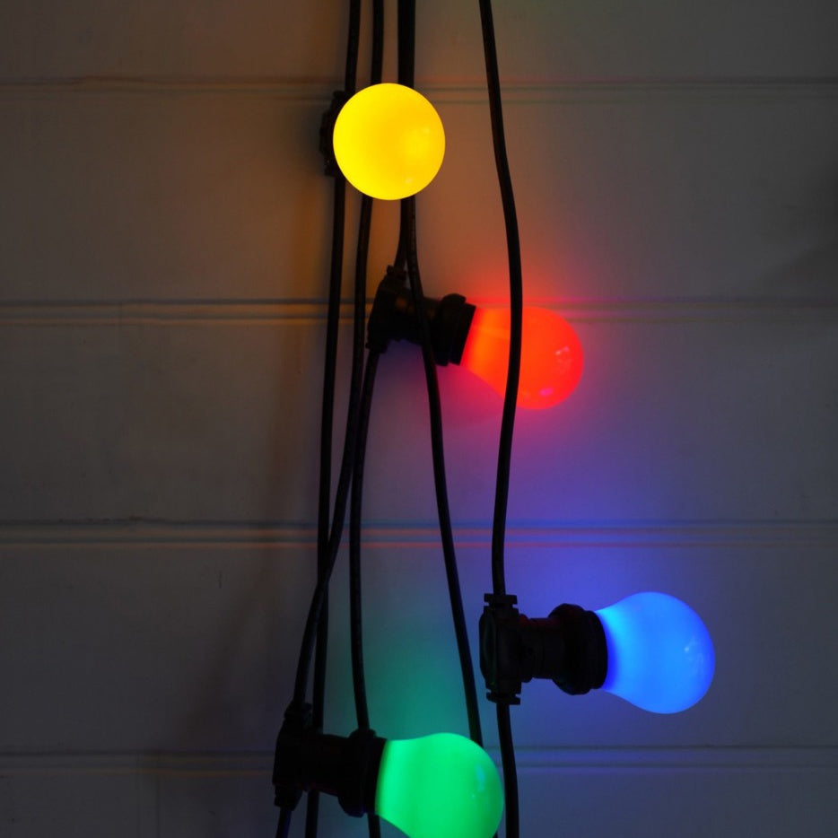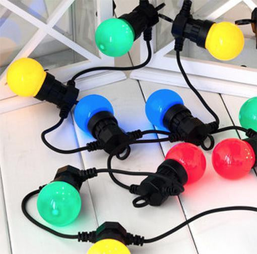 In total there are 14 coloured bulbs on a ten metre black heavy duty waterproof cable, spaced 70cm apart. The A60 sized bulbs are plastic for durability.