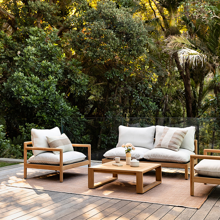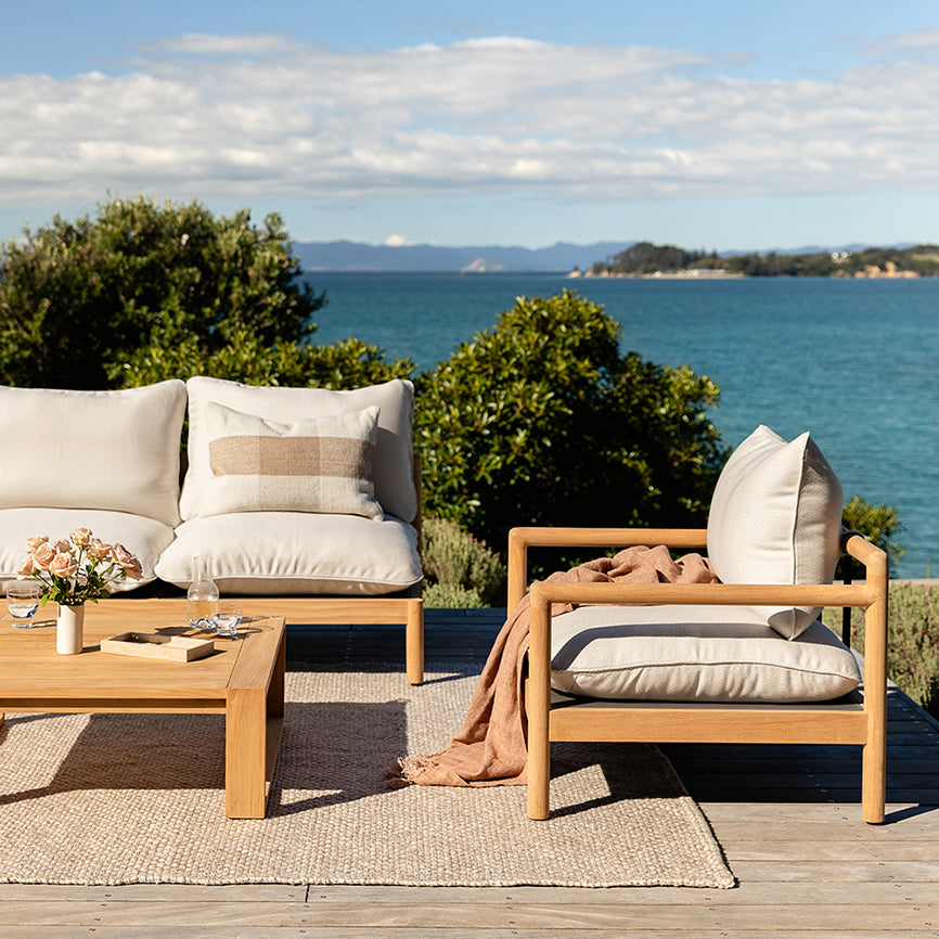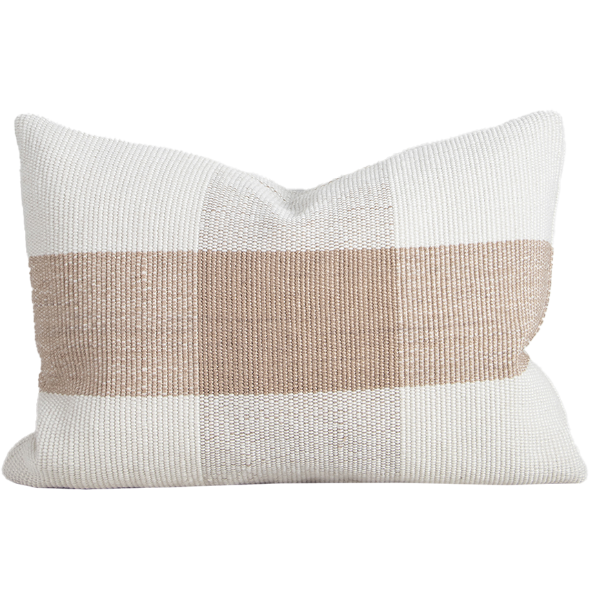 This textured Kinley cushion will look good both indoors and outdoors, woven in tones of cumin and nougat.