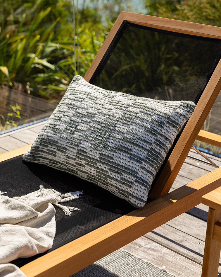 Add bold geometric design to the outdoors with the contemporary aesthetic of the Scout cushion. Handcrafted in soft eucalyptus tones on a natural base, the raised woven pattern provides a simple, textural aesthetic for a modern living space.