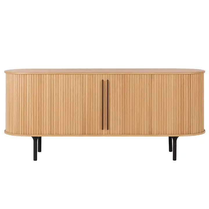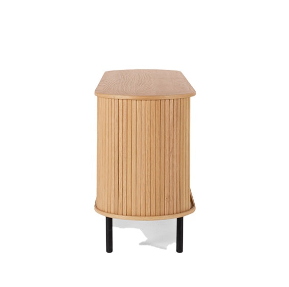 Contemporary solid oak palliser sideboard with oak veneers and engineered joints. It features quality hardware, internal shelves and black sculptured timber legs.