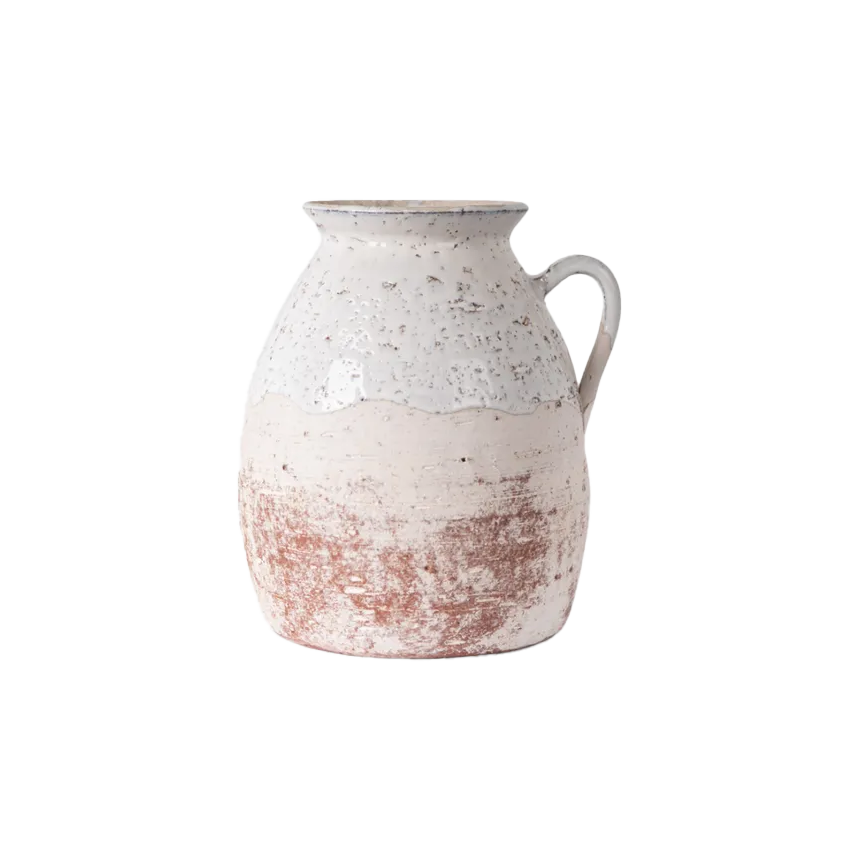 This richly textured handcrafted terracotta jug features a warm stone gloss glaze contrasted with a natural rustic finish at the base.