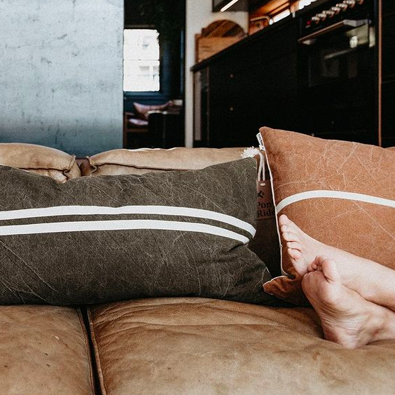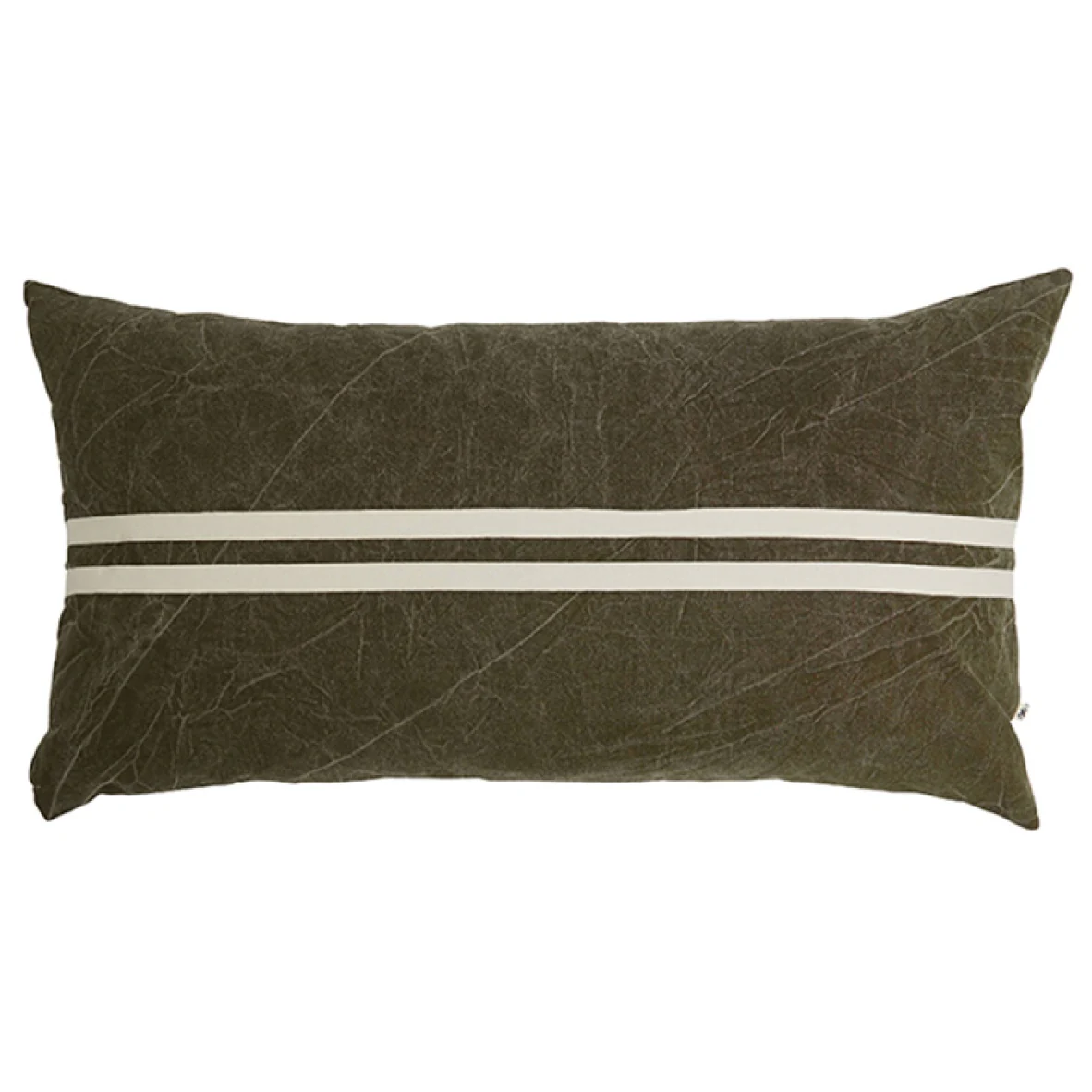 The cushion cover is made from durable stonewashed canvas, and features a cream ribbon detail stitched through the centre of the front of the cushion for a simple militant feature. The reverse of the cushion is plain cream.