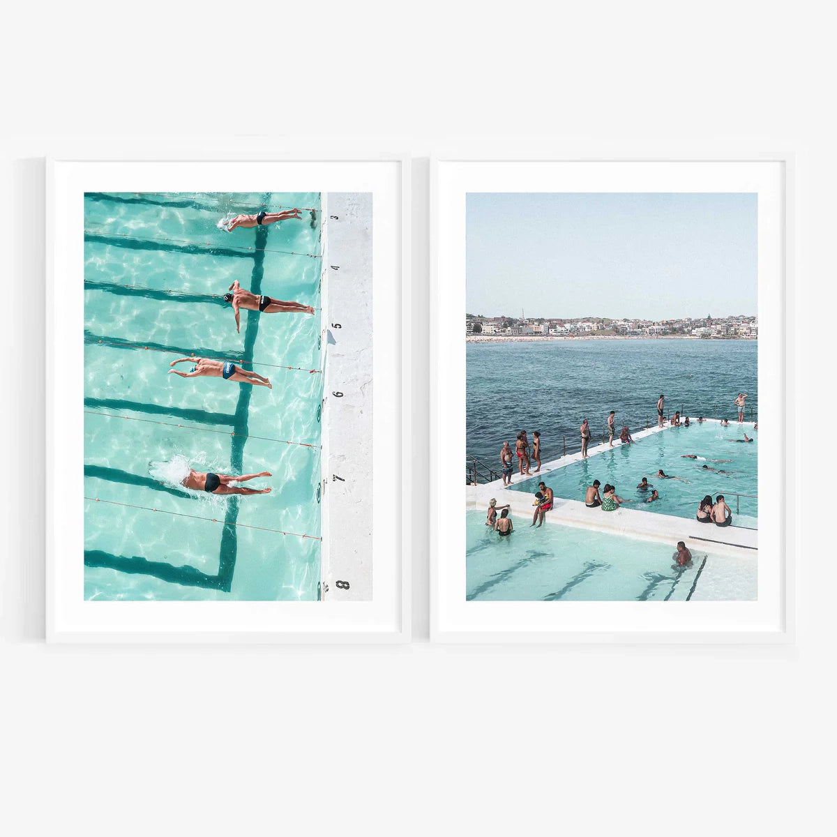 This photographic print features swimmers at the iconic swim club Icebergs in Bondi Beach, Sydney, during the Winter.