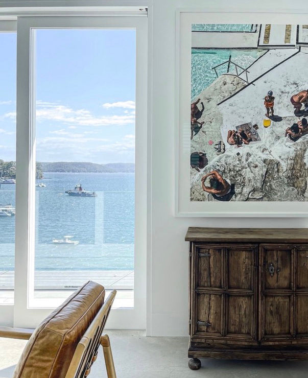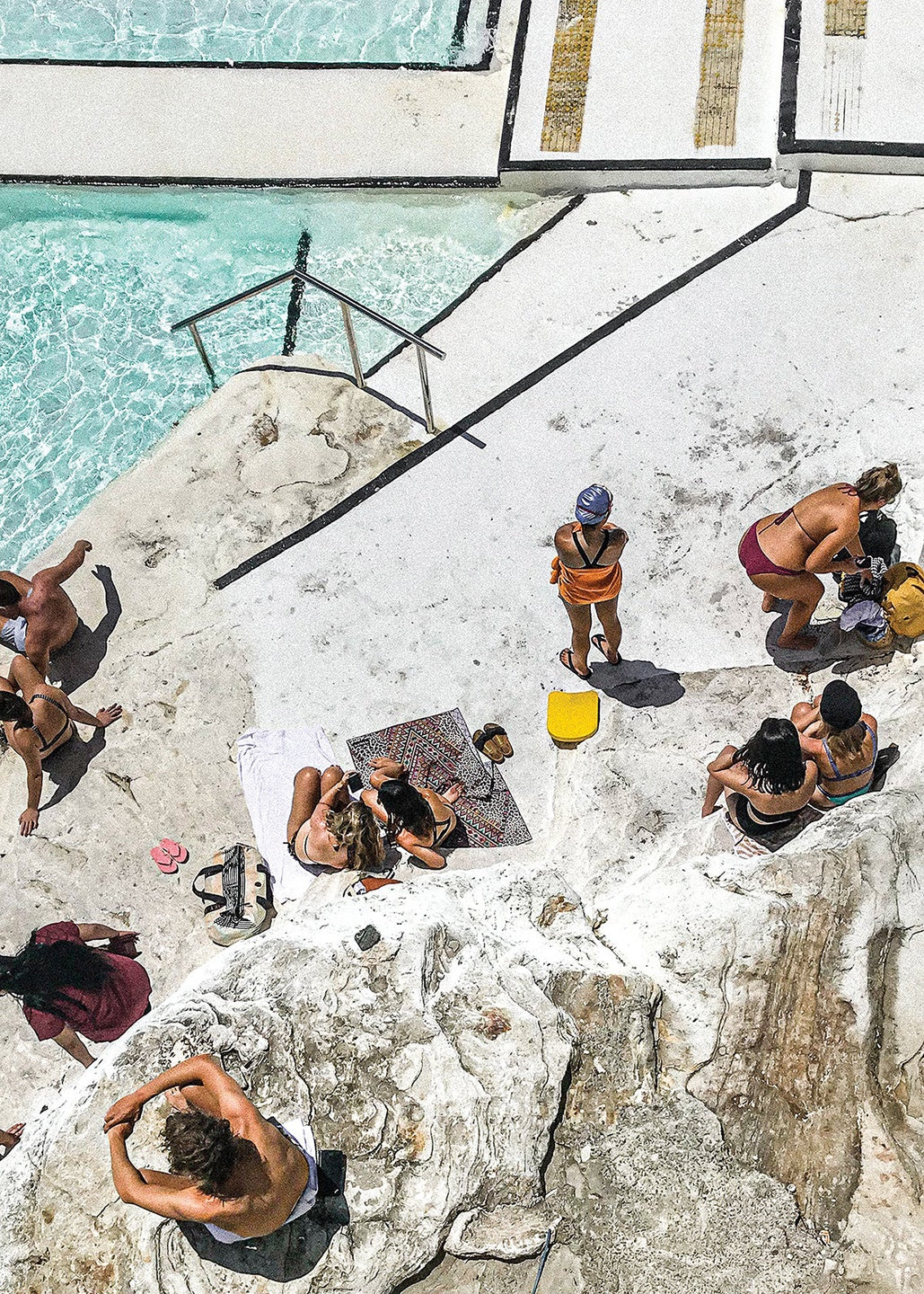 This photographic print features sunseekers on the steps of the iconic swim club Icebergs in Bondi Beach, Sydney.