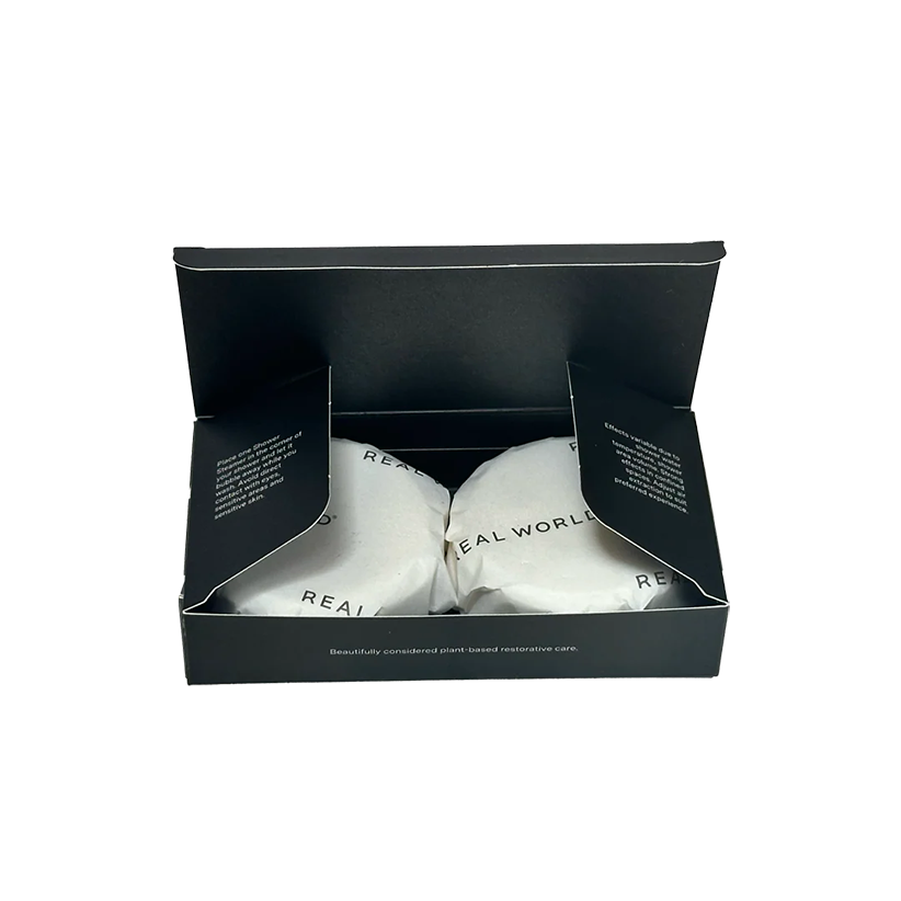 Box of two shower steamers, a revitalising sensory experience to kickstart your day from Real World.