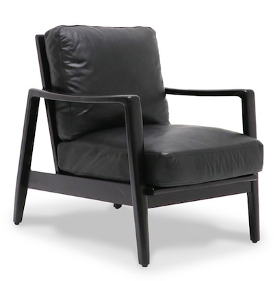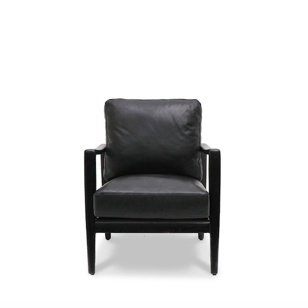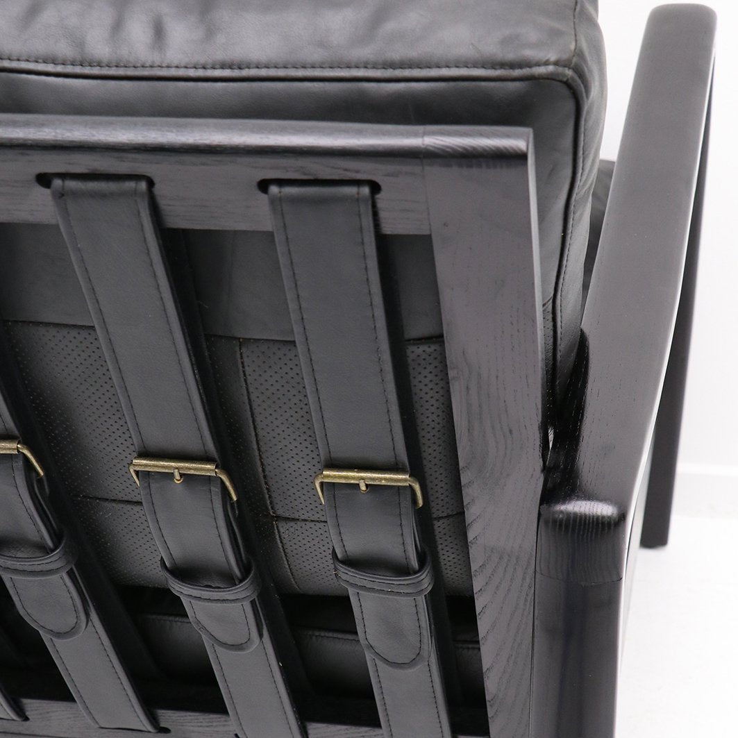The chair frame is made from stained American ash wood, and the cushions are immaculately upholstered in a black full grain leather. The leather has been hand-dyed, making each leather cushion unique to itself.