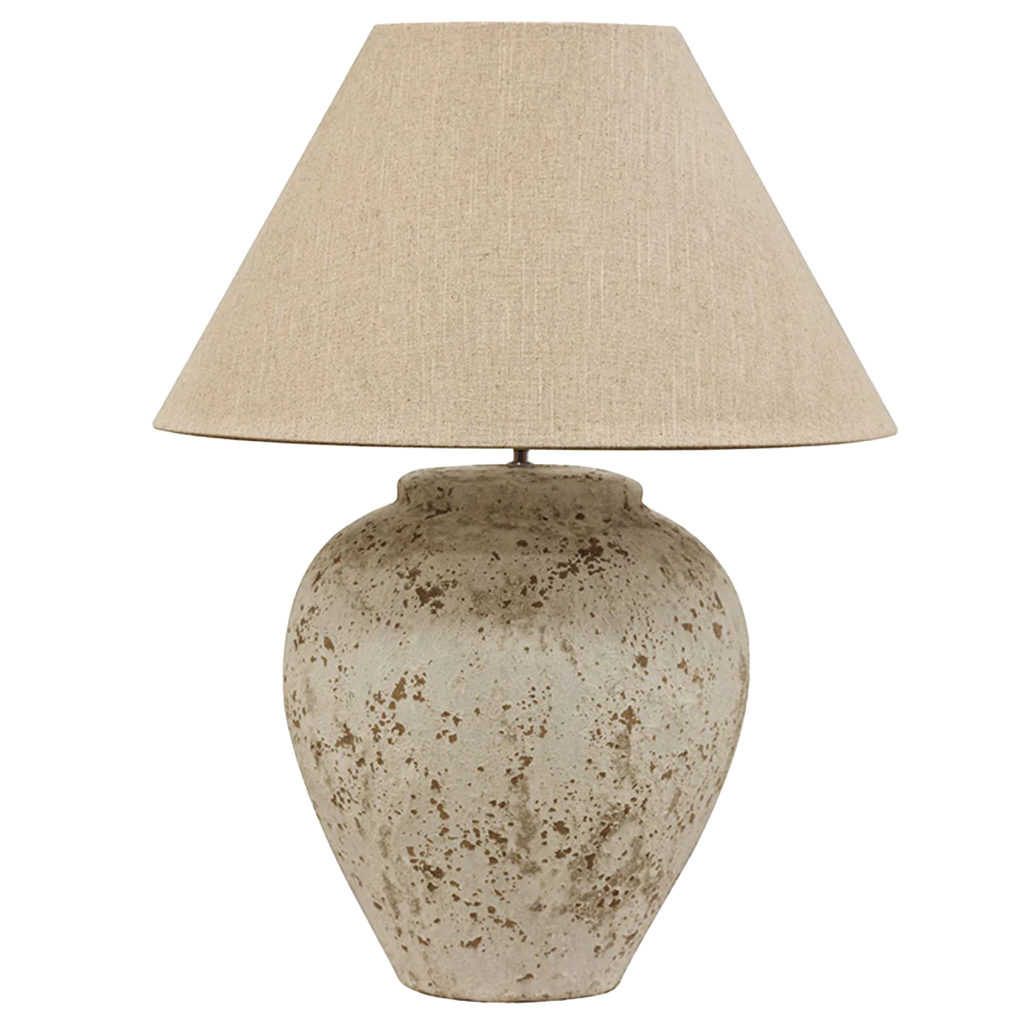 Add tone and texture to your home with this striking large rounded Tuscan-style stone finish lamp, beautifully paired with a raw linen drum shade.