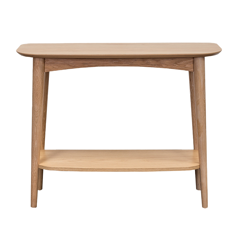 The console table features a top and a bottom shelf. It is made of solid oak with oak veneers and engineered mitred joints.