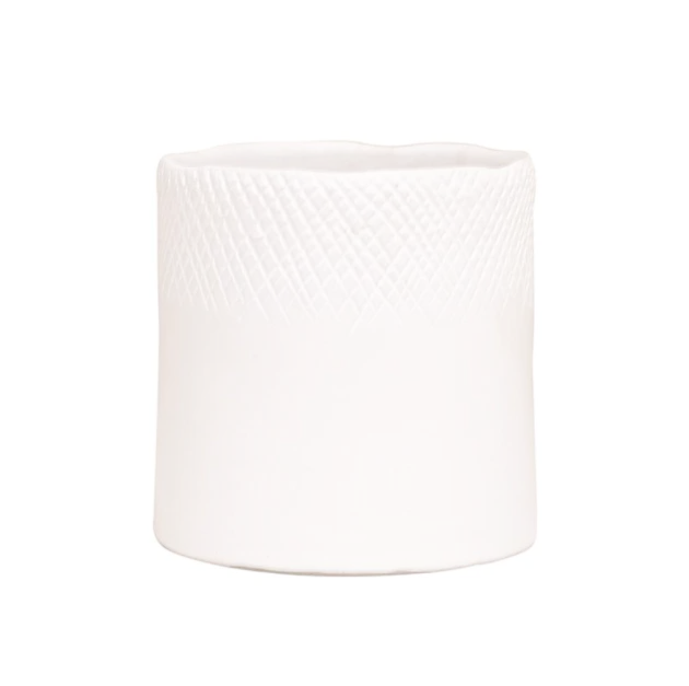 Minimalist planter crafted from terracotta, and featuring a subtle criss-cross textured band around the rim.
