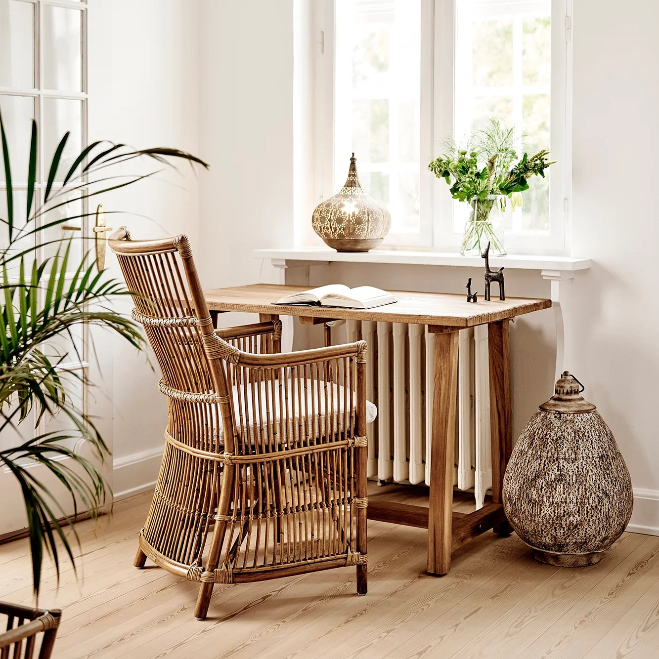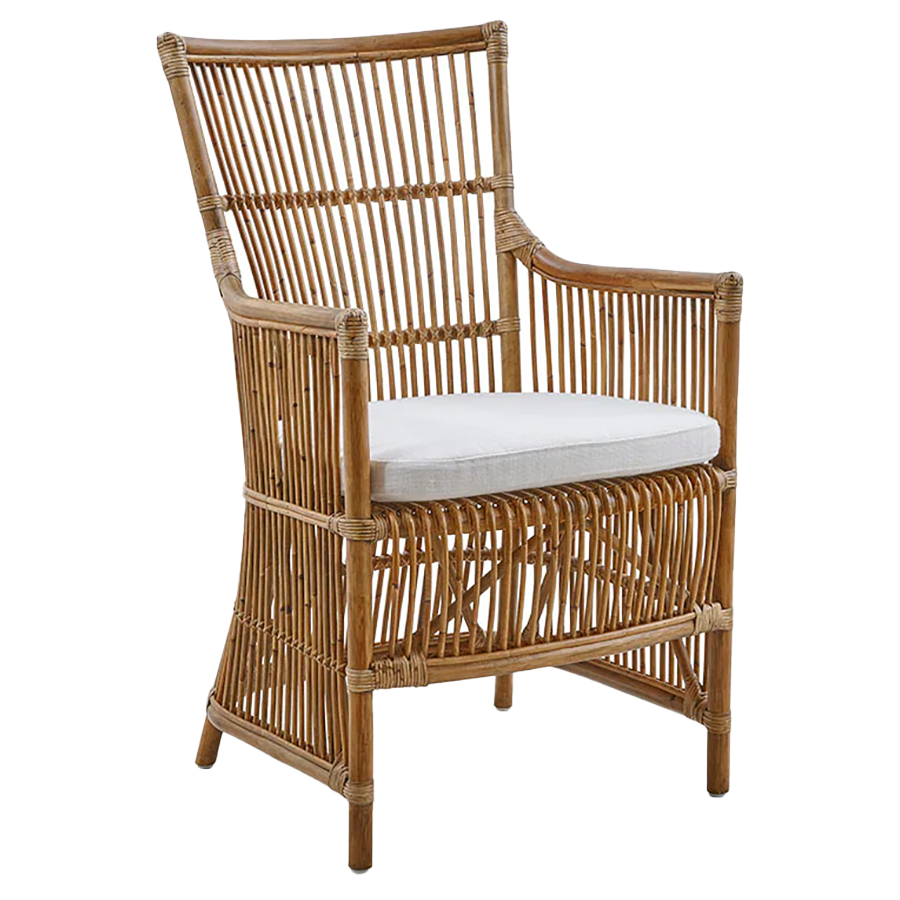 The timeless Da Vinci armchair is handcrafted from natural rattan. Providing all-around support with upright bars, arm rests and a white seat cushion. Handmade in Denmark using sustainable natural rattan material.