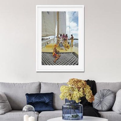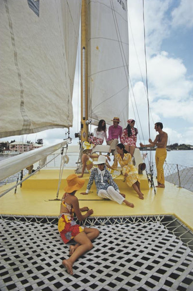 'A Colourful Crew' was taken by famous photographer, Slim Aarons in 1970. A group of colourfully dressed friends on board the Calypso clothing store owned boat, Bermuda.