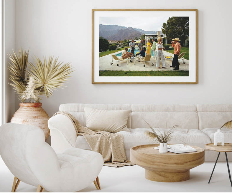 'Desert House Party' was taken by famous photographer, Slim Aarons, at a poolside party in Palm Springs in 1970. The house was designed by Richard Neutra for Edgar Kaufman. Featured in the group are: industrial designer Raymond Loewy (centre, standing), Nelda Linsk (in yellow), wife of art dealer Joseph Linsk, and Helen Dzo Dzo (second from right).