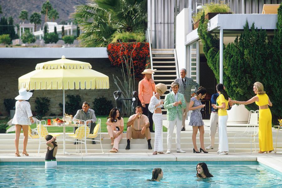 'Kaufmann Desert House' was taken by famous photographer, Slim Aarons, at a poolside party in Palm Springs in 1970. The house was designed by Richard Neutra in 1946, for Edgar Kaufman. Stylish and fashionably dressed guests enjoy drinks at the side of the swimming pool, whilst others take a dip in the pool.