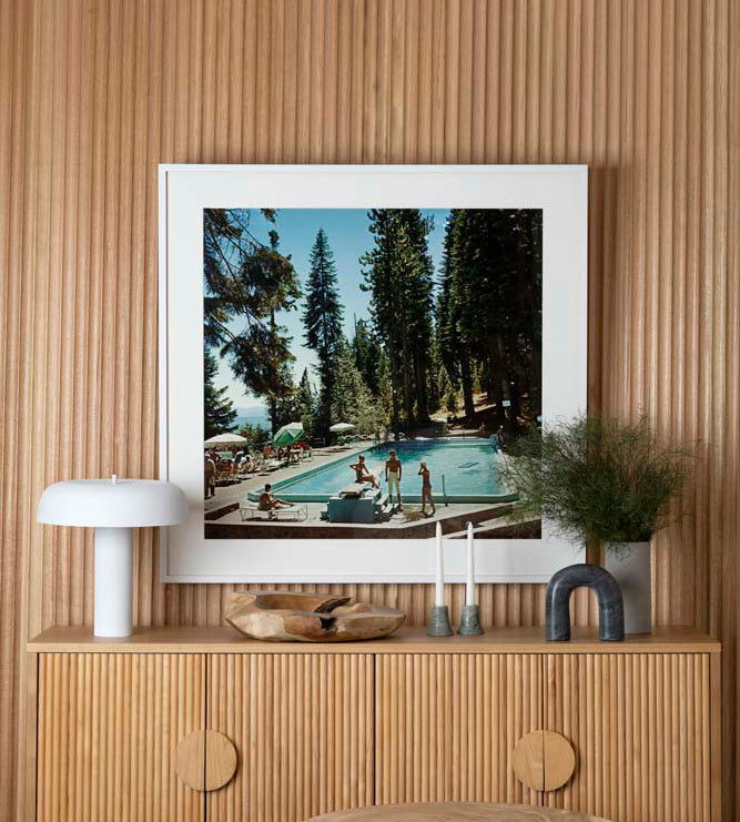 'Pool at Lake Tahoe' was taken by famous photographer, Slim Aarons, by a pool on the shores of Lake Tahoe in 1959. Aarons is renowned for his evocative photographs of, as he described it, "attractive people doing attractive things in attractive places."