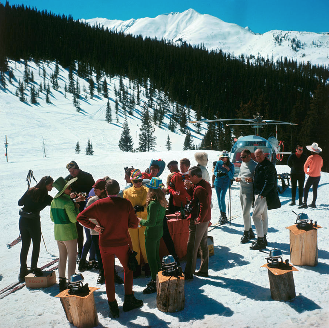 'Snowmass Picnic’ was taken by famous photographer, Slim Aarons, in 1967. A stand-up fondue picnic for skiers at Snowmass-at-Aspen, Colorado.