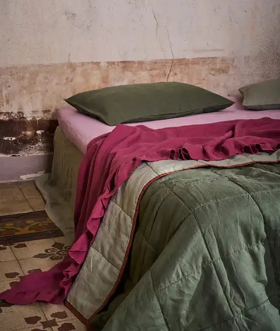 Beautiful double sided quilt featuring two gorgeous tones of soft green - pistachio and artichoke, with a warm contrasting terracotta edge.