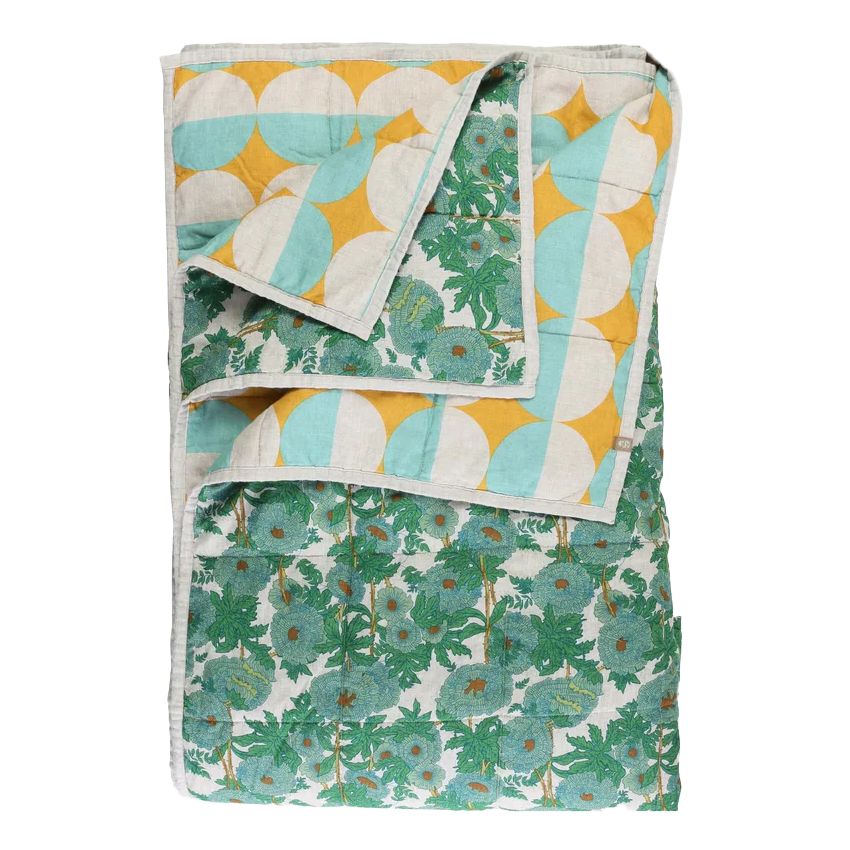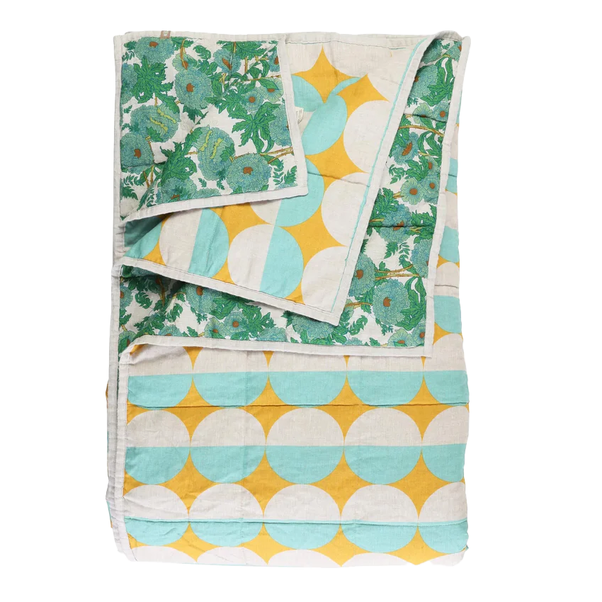 Beautiful double sided quilt featuring a blue flower design on one side and a retro mid-century blue and yellow print on the other.