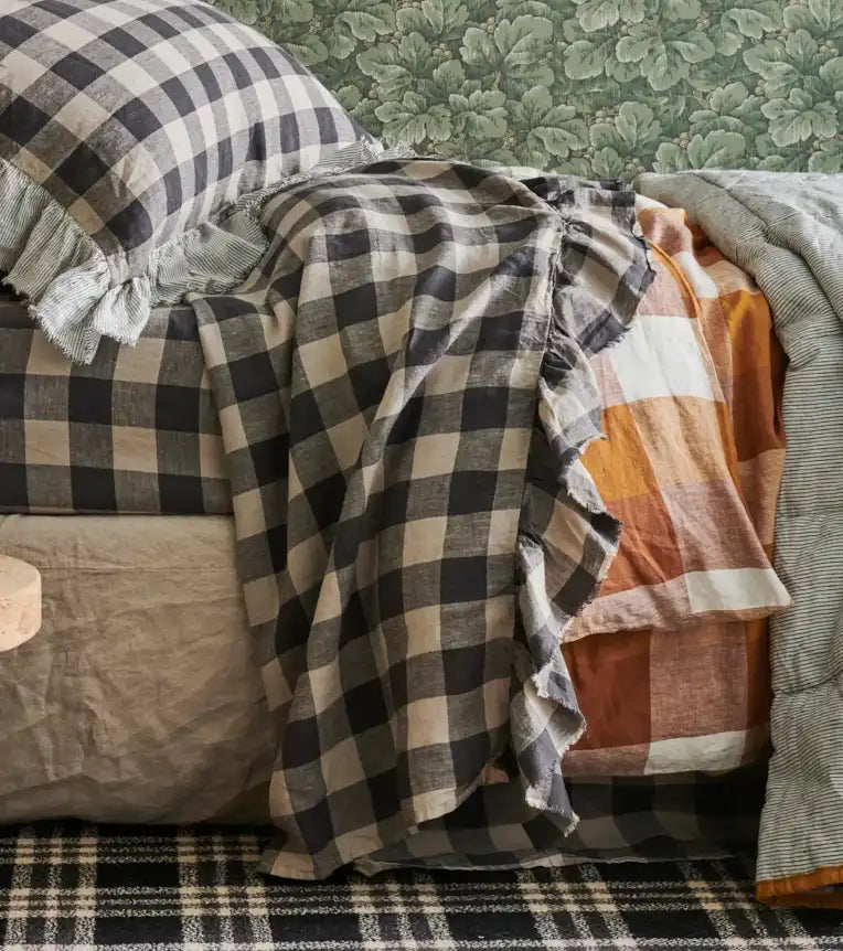 Made of 100% French flax pre-washed linen. The ruffle has a raw edge (no seam) that will fray over time.