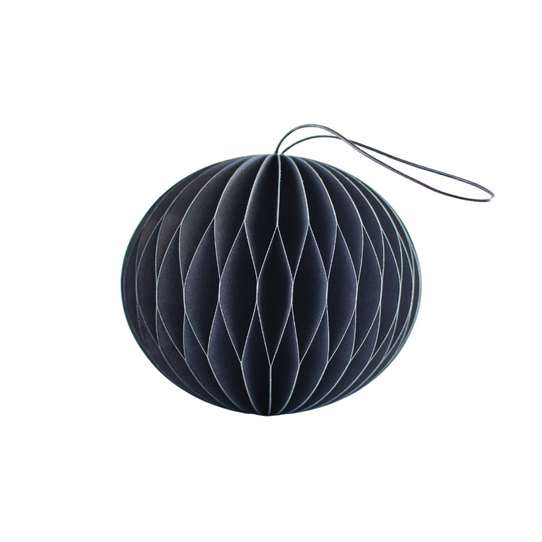 A beautifully handmade sphere paper ornament featuring a leather string.
