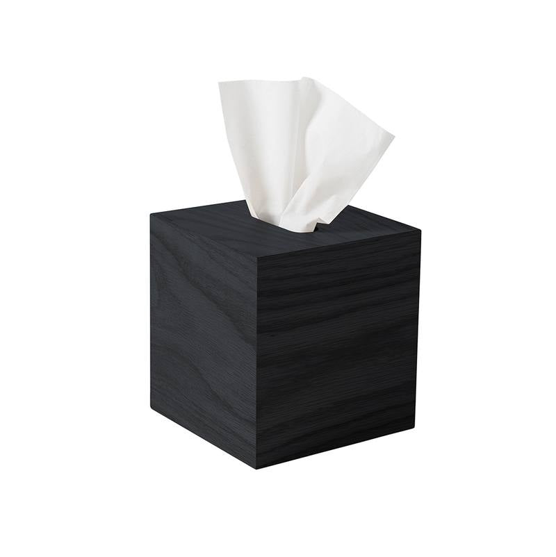 The bottom slides to enclose a standard square size tissue box. Made of oak veneer.
