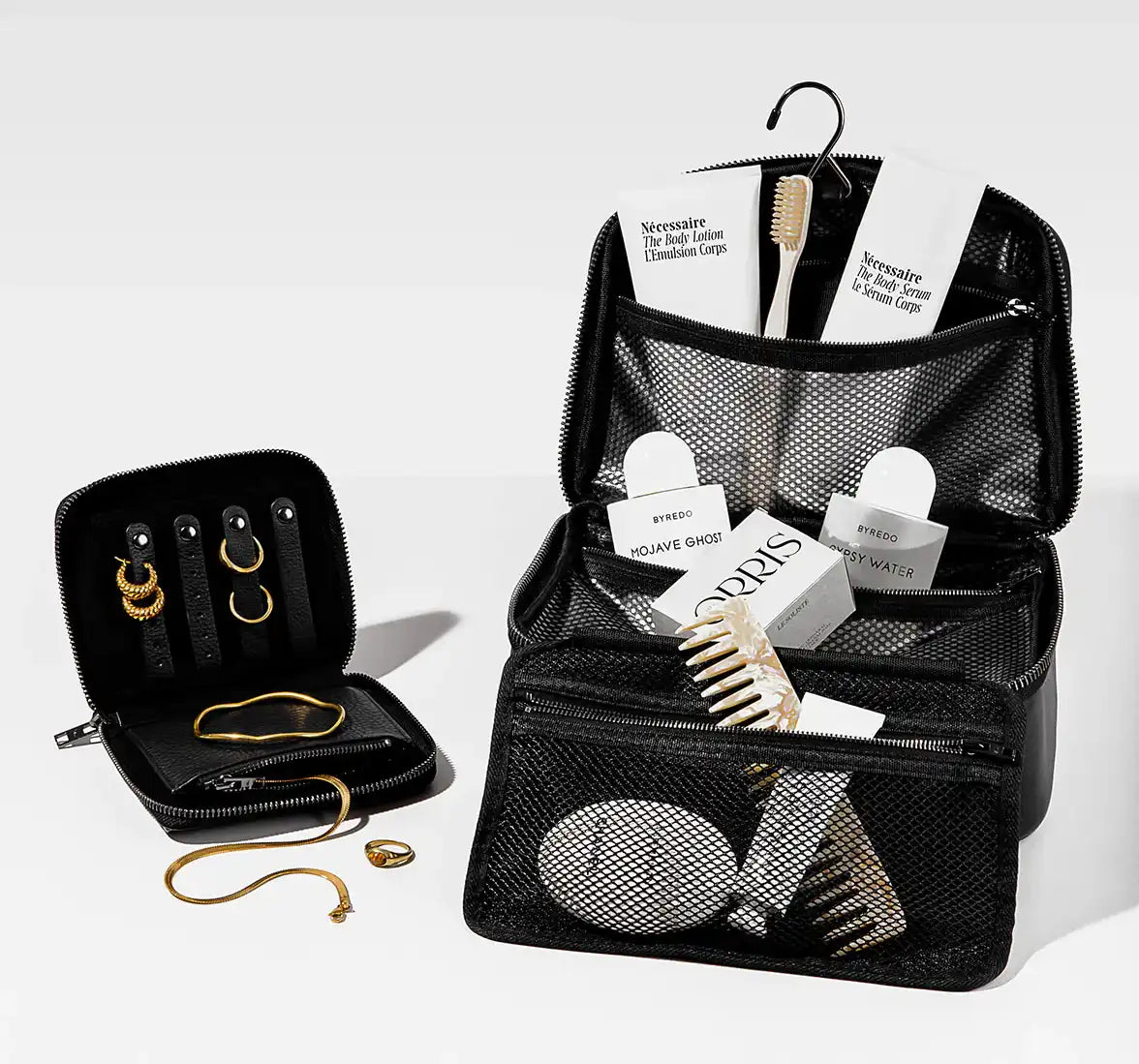 The large toiletry bag unzips to open out into 3 sections, either flat on a table or hung on a hook.