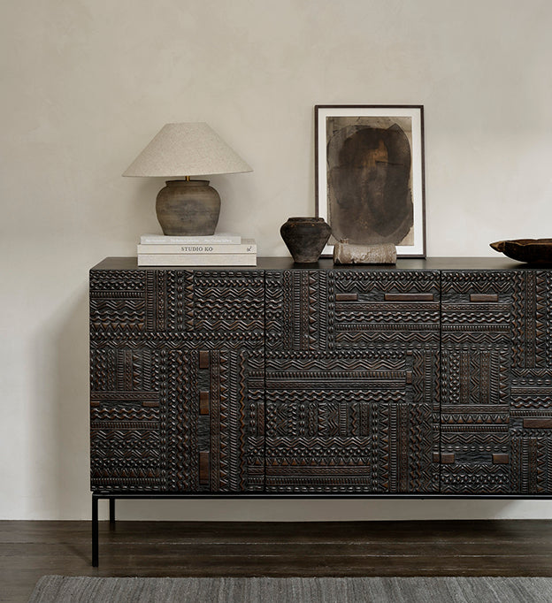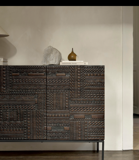 Contemporary wooden furniture are transformed into pieces of art where each pattern is carefully carved by artisans. Named after the Tabwa culture from Central Africa, the pattern's inspiration comes from their fondness for linear geometric motifs.