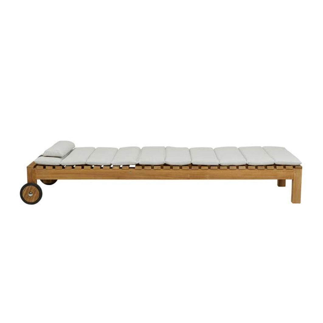Teak outdoor lounger with tufted squab off white