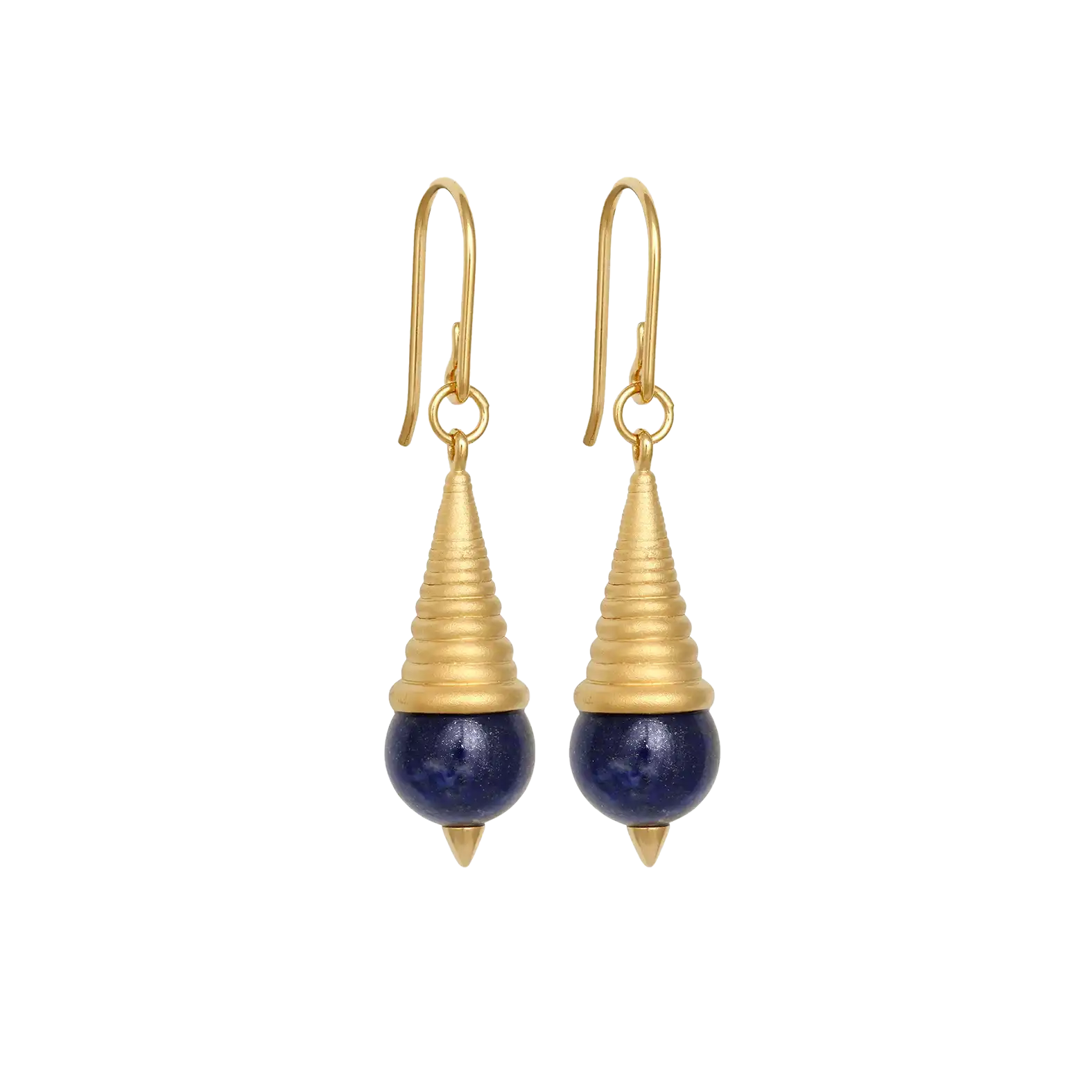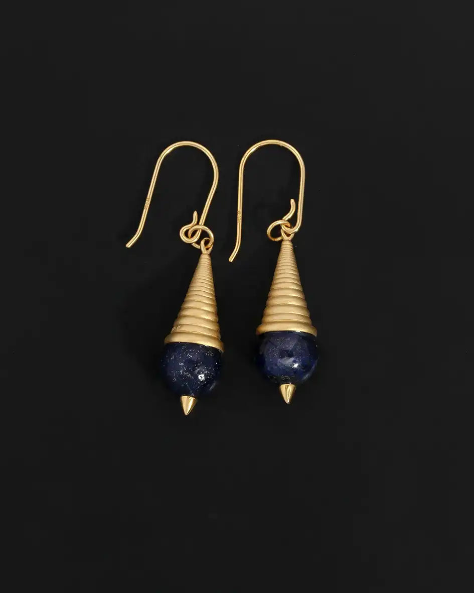 The Danu earrings by Temple of the Sun feature a tapered, ridged cone form that drops into a polished lapis lazuli sphere. A pointed finial anchors the base, lending structure and balance to the silhouette.