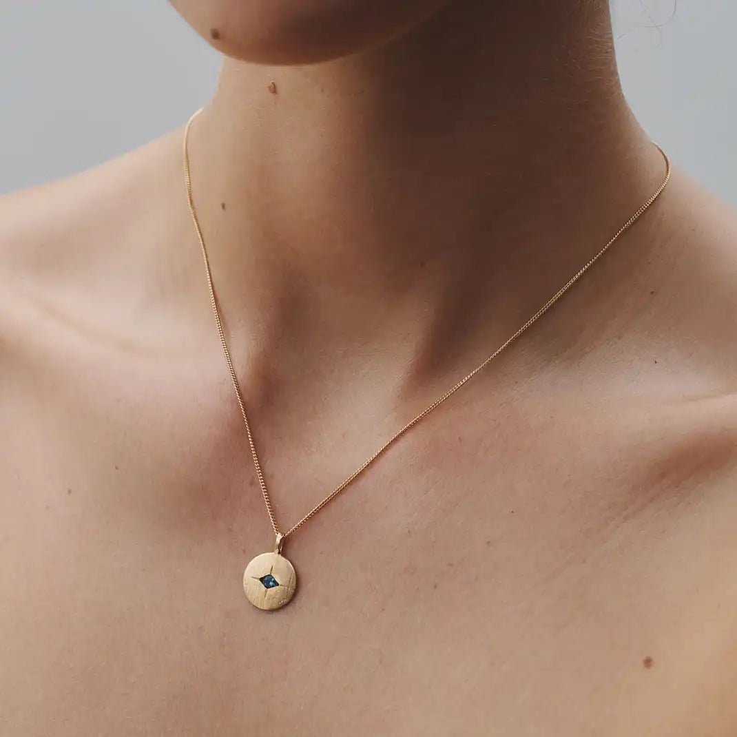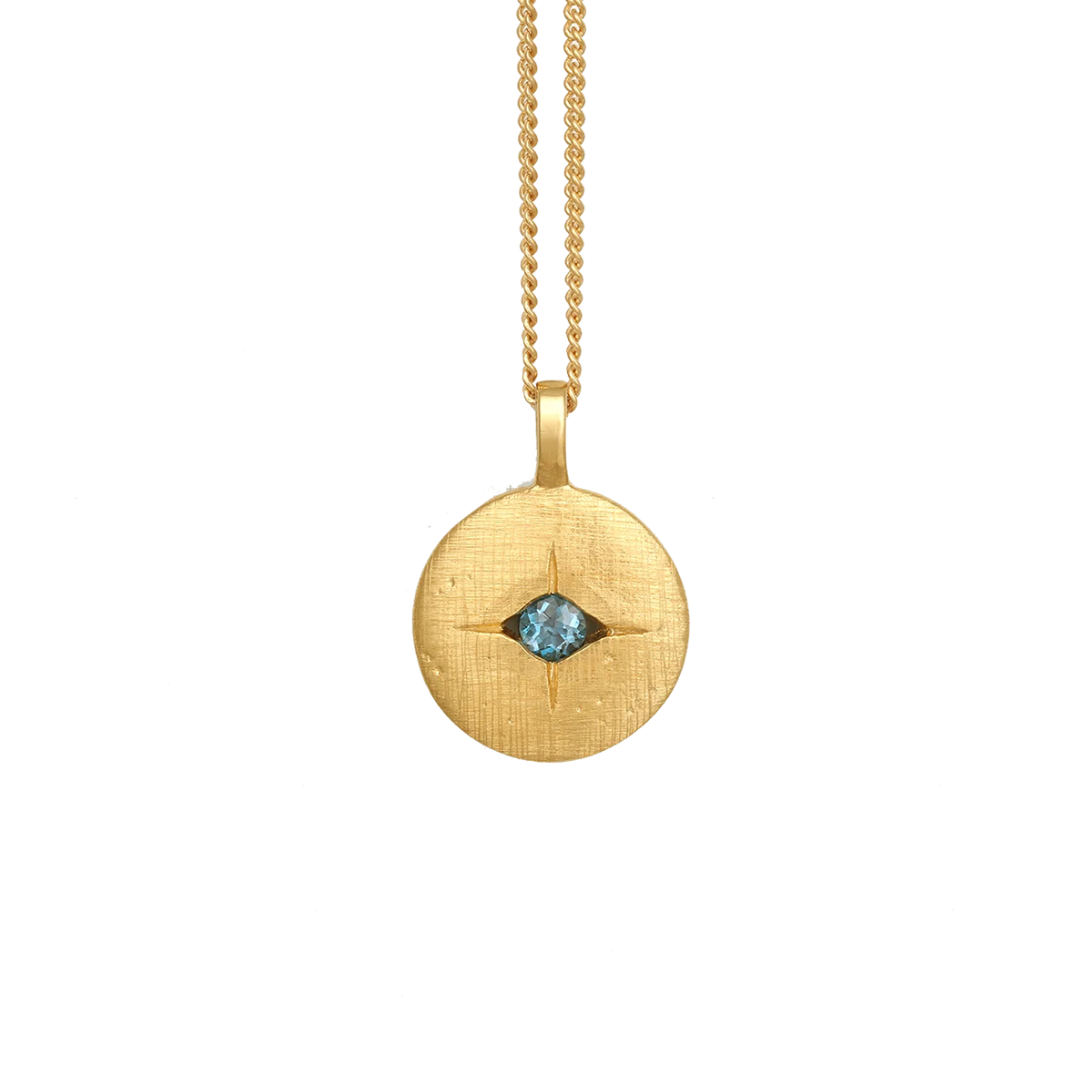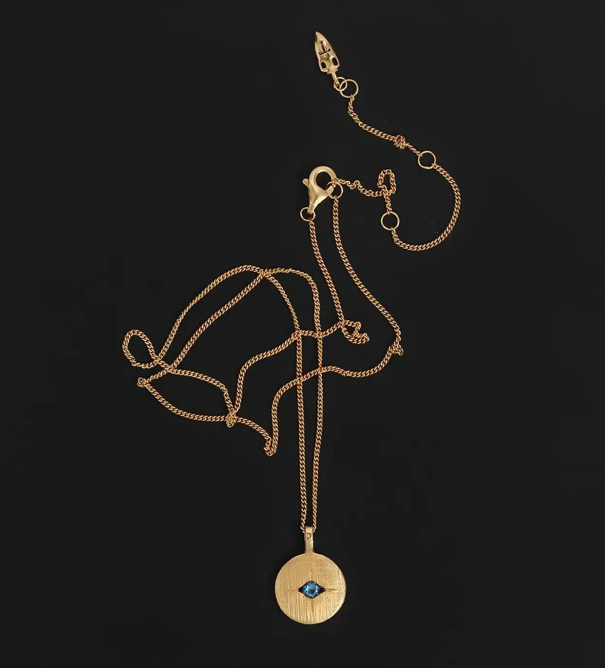 The Mavi eye necklace by Temple of the Sun features a cross-brushed pendant suspended from a single curb chain. The carved evil eye motif—set with London blue topaz—forms a modern amulet, long associated with protection and warding off harm.