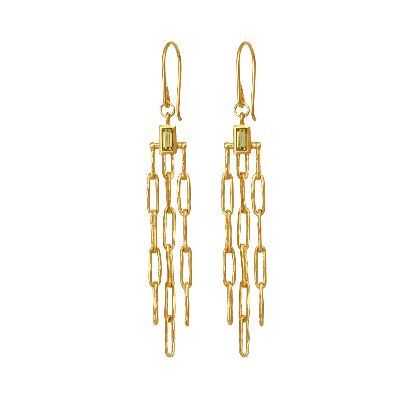The Olea earrings by Temple of the Sun are elegant and timeless. Featuring a bold chandelier style earring with a baguette cut Peridot at its heart.