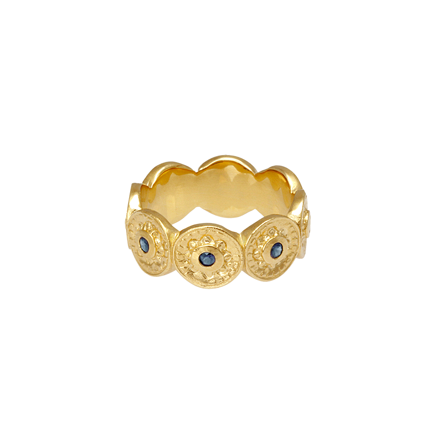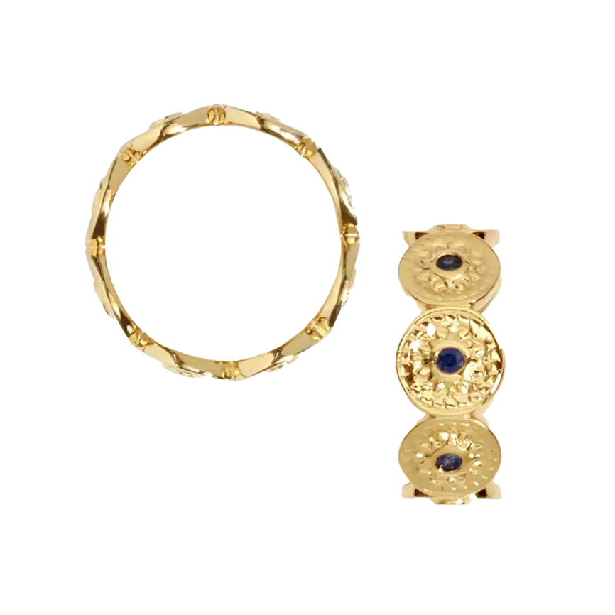 The Vesta Ring by Temple of the Sun is beautifully presented in tumbled gold vermeil and features three delicate sapphires that guide us with their wisdom and bring the energy of the sun and moon into our daily practices.