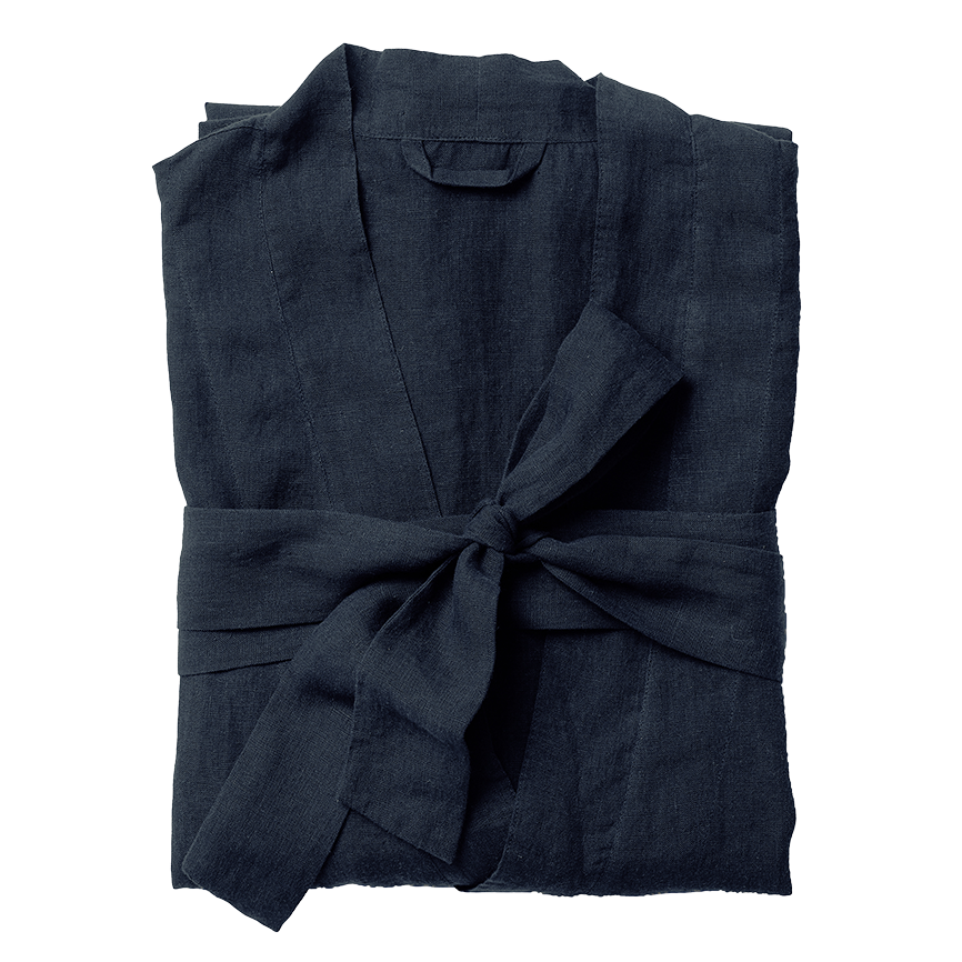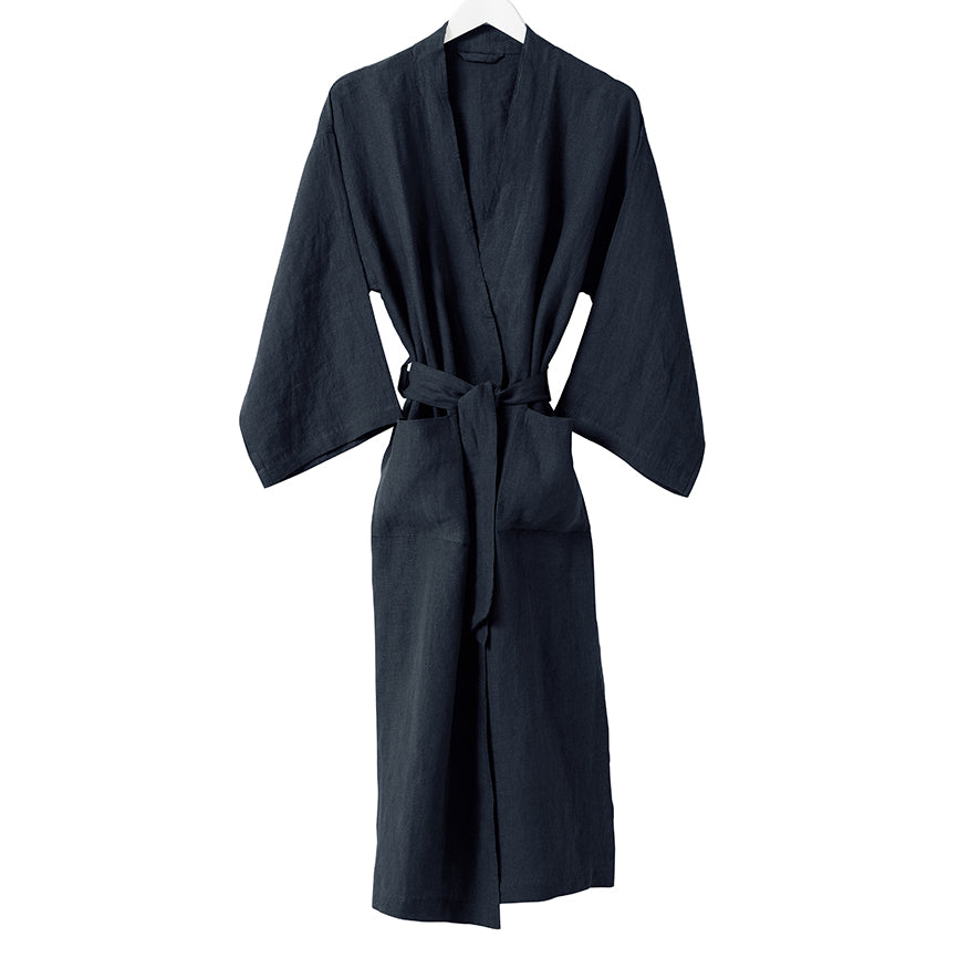 The deep midnight blue robe has a relaxed fit with a belt that ties comfortably at the waist. Made from 100% linen.
