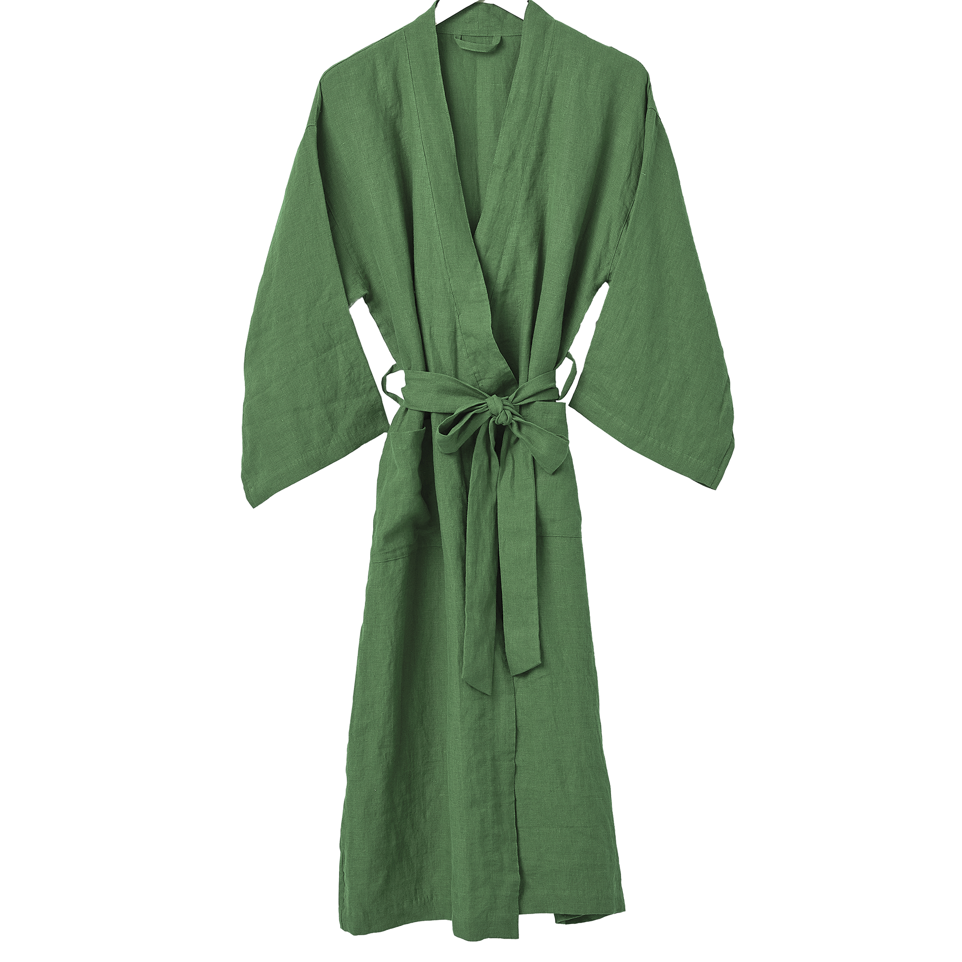 The bold spearmint green robe has a relaxed fit with a belt that ties comfortably at the waist. Made from 100% linen.