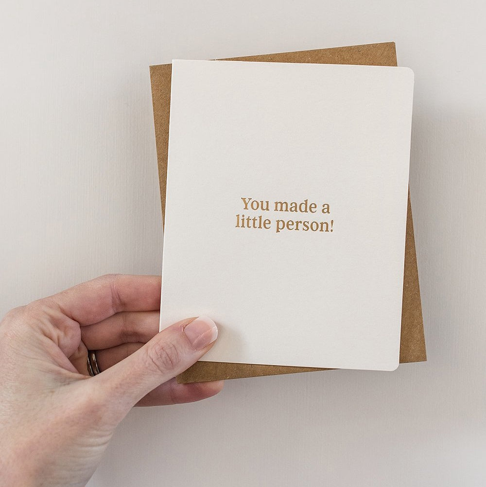 'You made a little person' printed in hot gold foil on cream card with a kraft envelope.